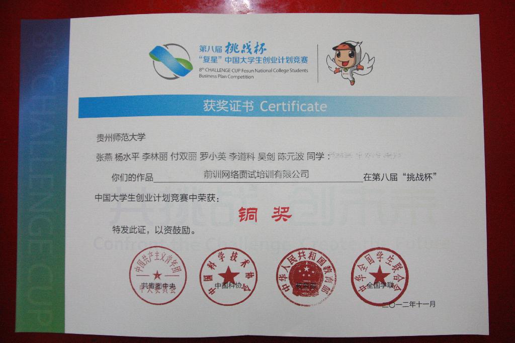 近日,由共青团中央、中国科协、教育部、全国学联、上海市人民政府共同主办,同济大学承办,复星集团协办的第八届“挑战杯”复星中国老员工创业计划竞赛中,由公司吴亮老师指导,张燕、杨水平、李林丽等8名员工的作品《前训网络面试培训有限公司》荣获铜奖。