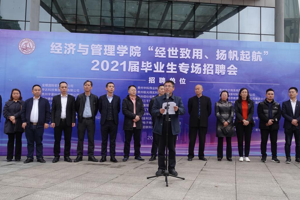 企业代表贵州惠智电子技术有限责任公司董事长刘诗明在开幕式上讲话。他代表各企业就公司和学经理期对人才的培养和推荐表示感谢,同时他还鼓励毕业生们充满信心、端正态度、务真求实地展现自己,找到心仪的工作岗位。他指出,能将每一件事做好的人就是人才,他希望毕业生们能在未来的职业生涯中成为能将每一件事都做好的人才。