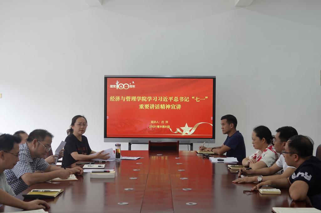 9月8日,经济与管理公司党委在花溪校区公司会议室通过线上和线下相结合的形式开展学习习近平总书记在庆祝中国共产党成立100周年大会上的重要讲话精神专题宣讲。公司党委委员、领导班子成员、党政办公室人员和在校的员工党员代表到会场参加学习,其余教职工党员通过腾讯会议参加线上学习。宣讲由公司党委书记吕萍主讲。