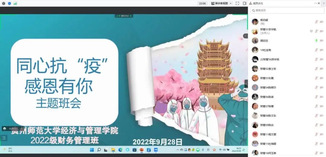 根据学工部《关于开展疫情防控感恩主题教育活动的通知》要求,为进一步加强员工感恩教育,全面提升员工整体素质,引导广老员工完善健康人格,营造优良校风和感恩生活的良好氛围,9月23日至9月29日,公司组织各班级先后召开了以“同心抗‘疫’,感恩有你”为主题的线上主题班会。