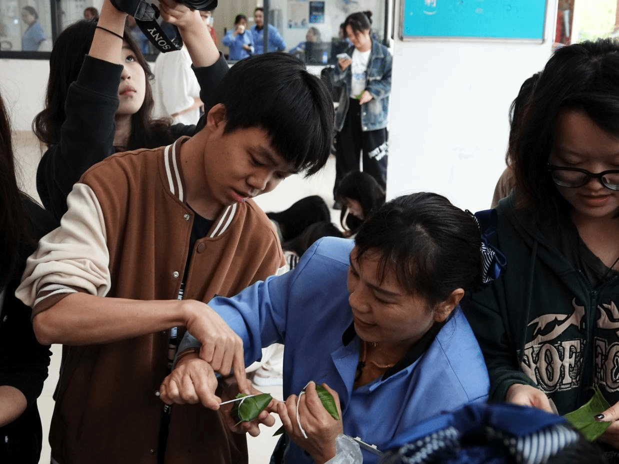 活动现场,粽叶清香四溢,糯米晶莹饱满。同学们热情参与,围坐一起学习包粽技巧。捋叶、填料、包裹、捆扎,一个个形态各异的粽子在欢声笑语中逐渐成型,劳动的喜悦与节日的温情交融流淌。随后的端午知识竞答环节气氛热烈,题目涵盖端午起源、龙舟竞渡、佩香囊、饮雄黄酒等各地特色习俗。同学们踊跃抢答,展现出对传统文化的浓厚兴趣和深入了解。