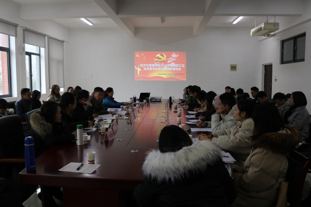 为深入贯彻落实《中国共产党支部工作条例(试行)》、严格党内政治生活和组织生活制度,推动全面从严治党向基层延伸,2019年1月4日上午,永利3044noc在花溪校区公司会议室召开了2018年度教职工生党支部书记抓党建述职评议大会。公司党政班子成员、教职工生党支部书记、支部委员及师生代表40余人到会,公司党委组织部干部封承杰参加。公司党委副书记赵本喜主持会议。